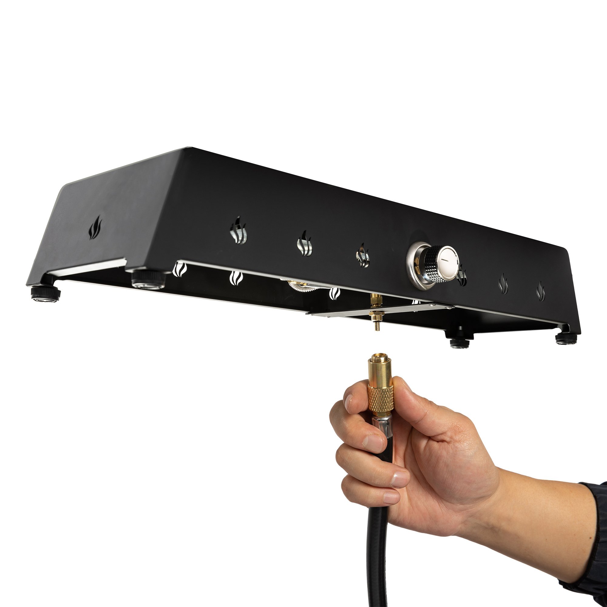 Quick connect regulator: Suitable for various useTwo ways to connect the fire pit:1. table with umbrella hole: Assemble this fire pit from bottom.2. Table without umbrella hole: Assemble this fire pit from the side