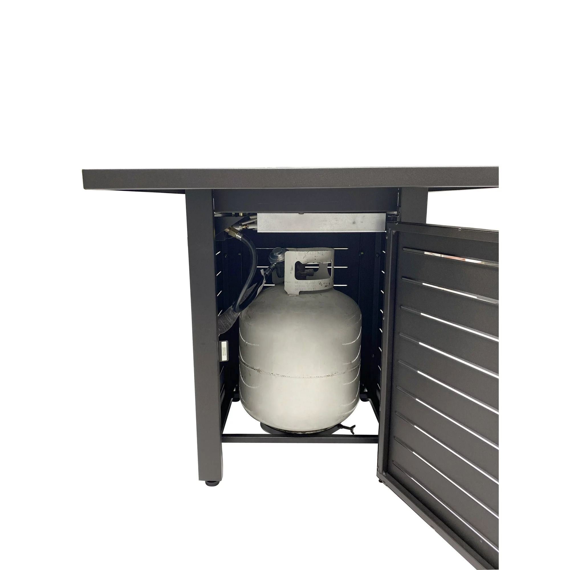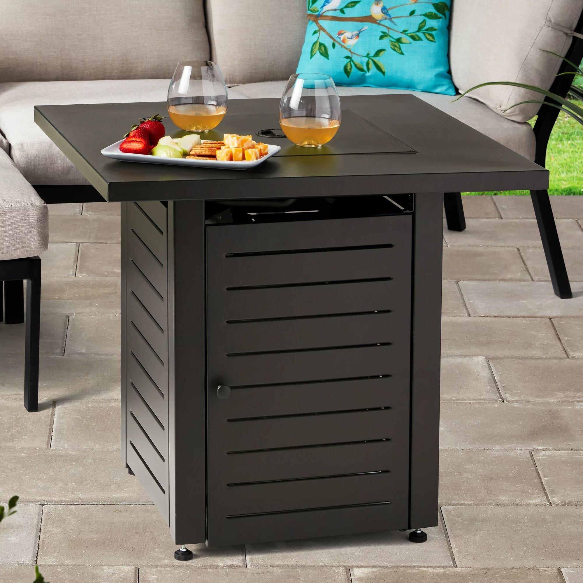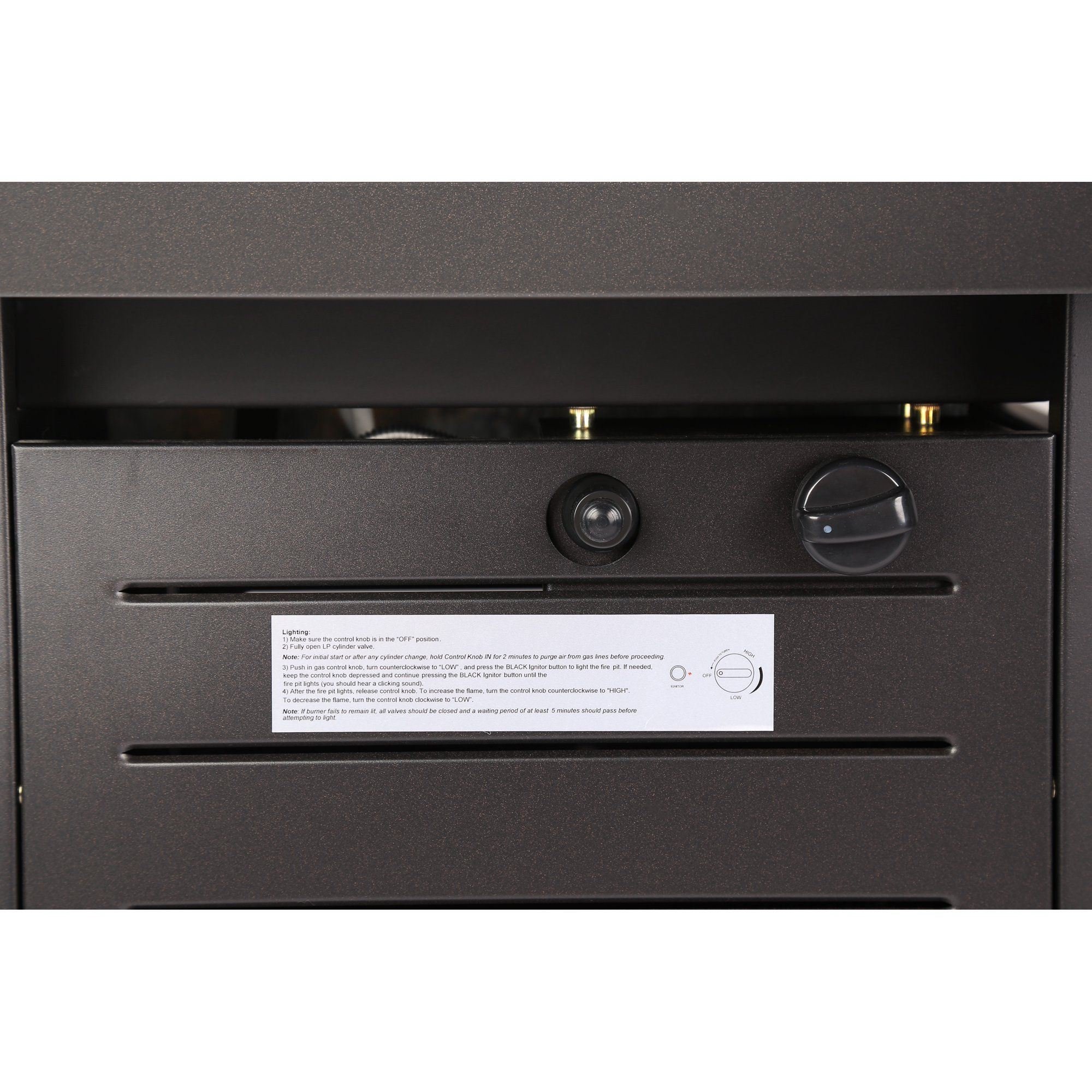 The 28" square propane fire pit will create a warm and welcoming environment for those cold nights. Heater controls allow the fire pit to burn at temperatures up to 50; 000 BTU. The fire pit is constructed of strong durable steel and is powder coated black and is available in various Provides long life in all weather conditions.The fire pit comes with a protective cover and exterior cover to protect the fire pit when not in use.The fire pit includes cabinets; gas hookup assembly and decorative insulating stones.The fire pit is powered by standard 20lb propane Canister (not included) provides fuel.Adjustable feet will create a level burning surface on uneven terrain.Assembles easily with included instructions and assembly tool.