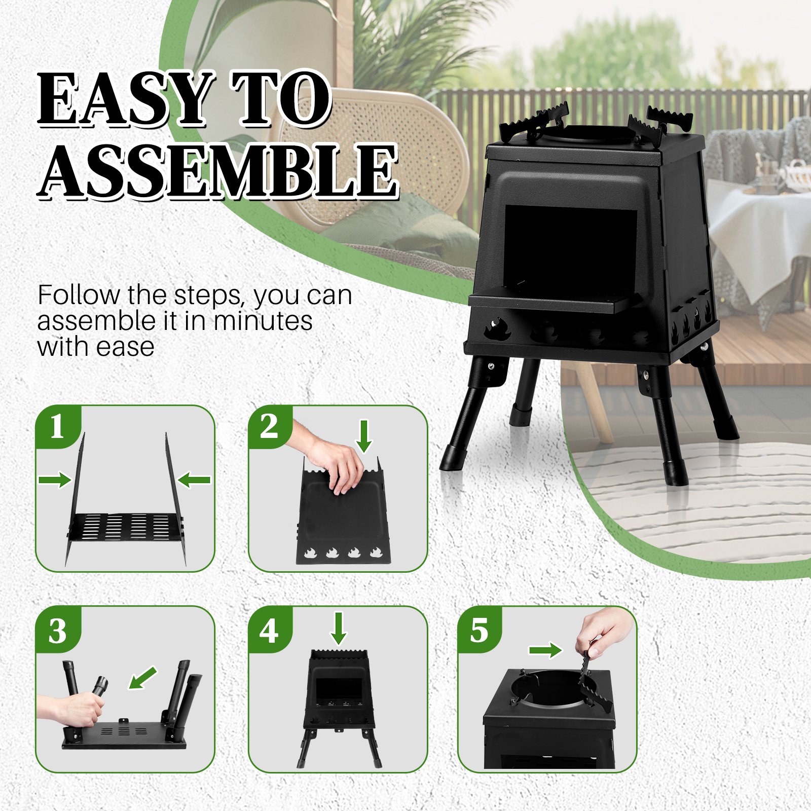 Portable design: This stove is welded from high-quality low-carbon steel. The camping stove is durable and easy to carry. The bottom of stove legs are rotatable and foldable to meet your different requirements.Easy to setup this survival stove within minutes.Equipped with a carrying bag for you to take it to anywhere you want.