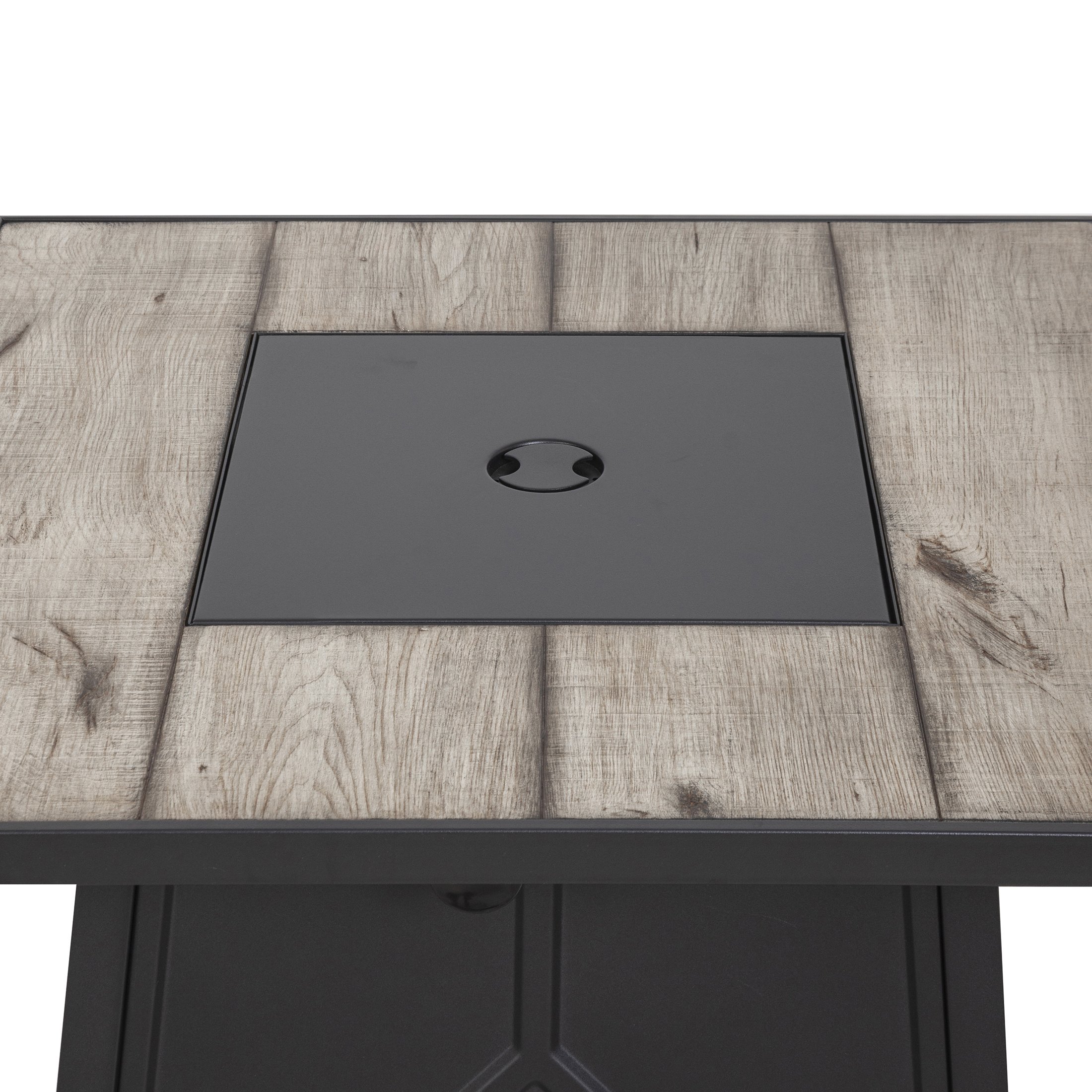 28 Inch Fire TableThe table top is mainly made of TerraFab, the base is metal. Its size is 28x28x25 inch. 40, 000 BTU fire pit is durable. This fire table ensures CAS-approved safety, enhanced quality, and improved performance for your everyday use. Each piece of the fire table is strictly tested before leaving the factory. It is easy to operate with the push-start ignition and adjustable flame option. With a simple push at the pulse switch and a turn at the valve knob, the electronic ignition system can start a beautiful fire in no time. When the flame dances on the lava rocks, it is an excellent patio fire pit table to keep you warm and intoxicated; close the fire lid and surround the woodgrain table top, and it is a coffee table. The included fire pit cover can also bring the best protection to this fire table.