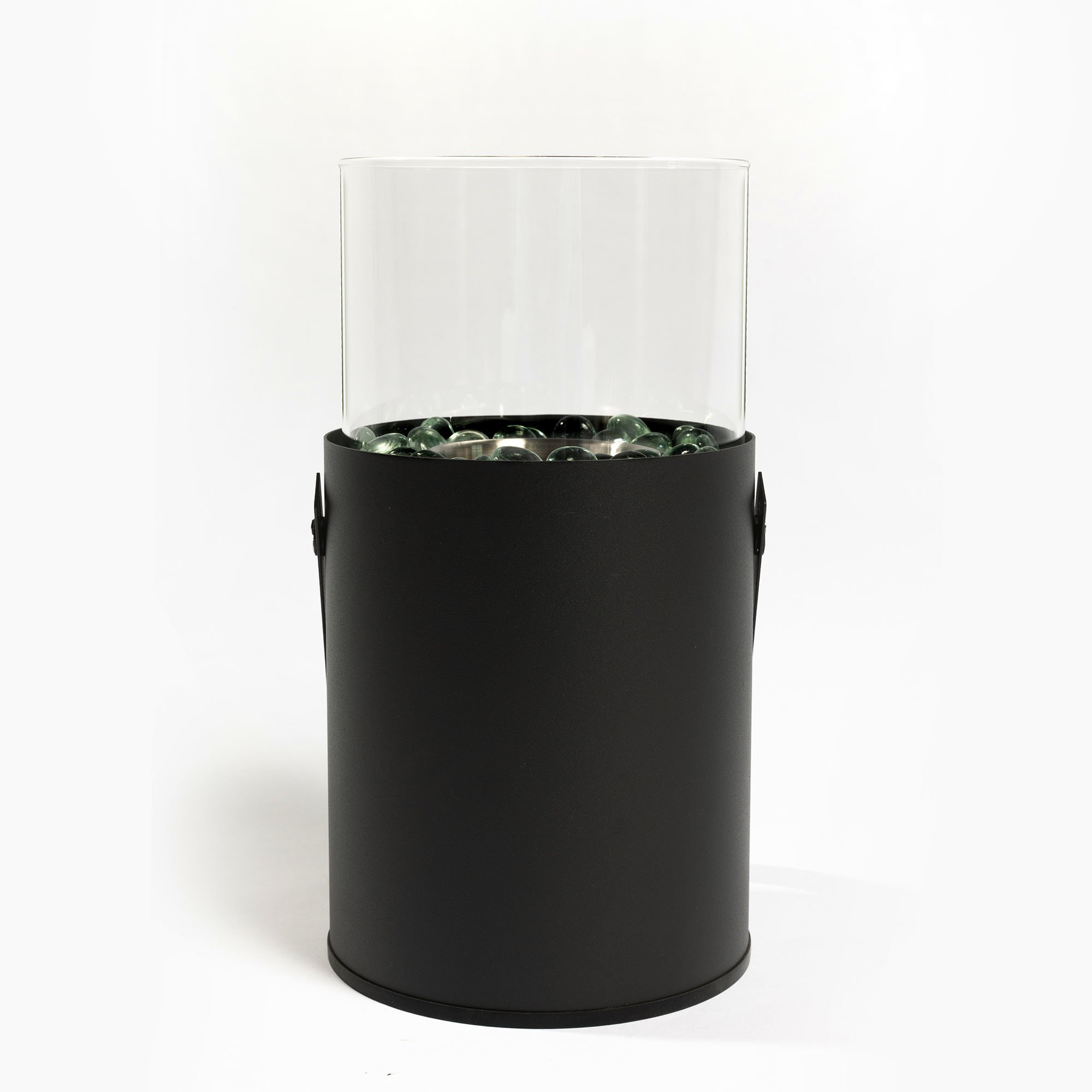 Tabletop Fire Pit, This simple and elegant portable fire pit features a durable metal base and clear glass hurricane