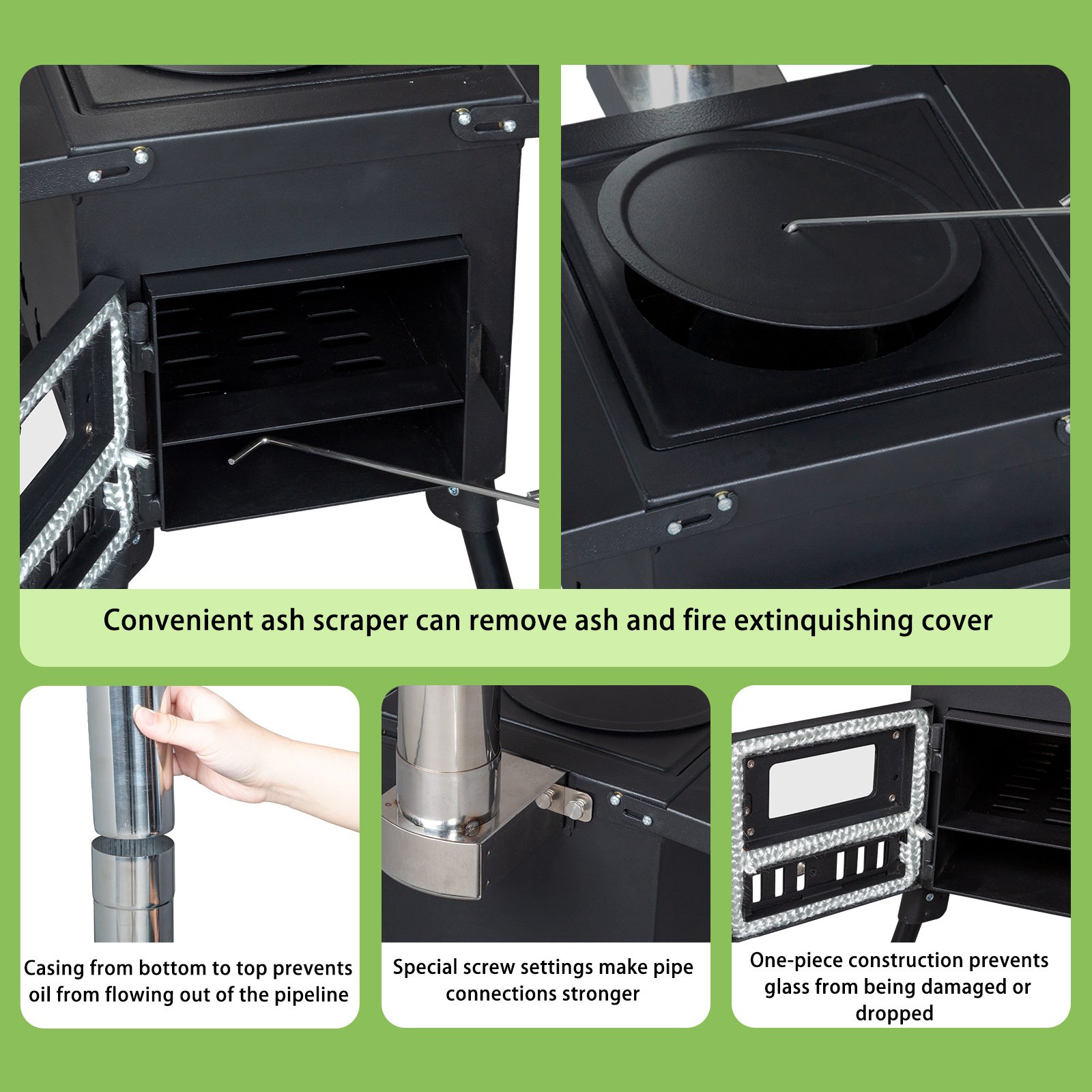 Highly flame retardant upgrade:Camping wood stove including 3 chimney pipes with a diameter and 1 fire blanket. Help you adjust the height to suit various places. Carbon steel with high-temperature heat-resistant black finish.Only for outdoor use with proper ventilation.It is suitable for heating and cooking with friends and family in winter.