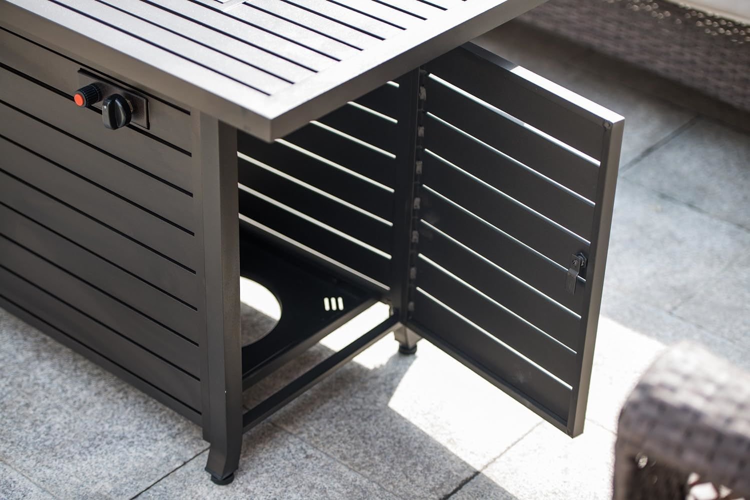 2. Gathering Heating Maker: 50,000BTU Gas Fire Pit Table provides ample warmth for your gatherings (8-10 people). Change your gas tank quickly with hideaway tank holder. Works with a standard 20-pound propane tank, propane gas fuel, warm and smoke-free burning, no polluting the environment, so you don't have to suffer from ash and smog.