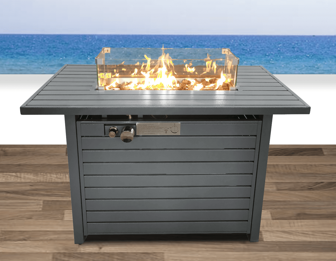 This outdoor fire pit table creates a cozy focal point in any backyard or patio space. Its a rectangular shape, with Steel construction in a slatted style, with a heat- and weather-resistant powder-coated finish. This fire pit is fueled by propane; it turns on with the push of a button and offers a 50000 BTU output, an adjustable flame, and an eight-hour burn time. The rectangular well in the center of this unit is filled with lava rocks. It includes batteries, as well as a protective cover. This fire pit accommodates a 20 lb. Gas tank (not included).