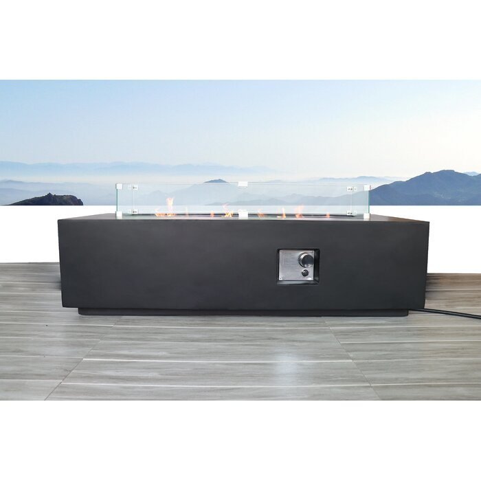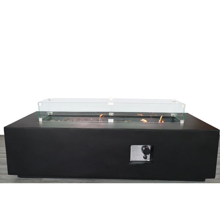FeaturesProduct TypeFire pit tableExterior MaterialFiber Reinforced ConcreteBurning Area MaterialStainless steelFuel TypePropane; Natural gasPieces Included1 fire pit; glass flame guardGas Conversion FeatureYesGas Conversion Kit IncludedNoAdjustable FlameYesIgnition TypePush-buttonBTU Output50000 BTUHeat Resistant CoatingYesFiller AccommodatedLava rocksFiller IncludedYesFoldableNoRust ResistantYesWeather ResistantYesPortableNoSpark Screen IncludedNoLog Grate IncludedNoProduct CareClean with mild soap and waterLocationOutdoor Use OnlyIs this Product Safe for Use on Wooden Deck?Can be placed directly on wooden deckGlass Shield IncludedYesBatteries RequiredYesBatteries IncludedYesProduct ShapeRectangularSupplier Intended and Approved UseResidential Use; Non Residential UseProduct Size (15" H x 56" W x 24" D Size)MediumImportedYesBattery or Battery IncludedYesSpecificationsETL ListedYesAssemblyLevel of AssemblyNoneAssembly RequiredNoWarrantyCommercial WarrantyYesProduct WarrantyYesWarranty Length1 YearFull or Limited WarrantyLimitedWarranty Details1 Year manufacturer limited warranty