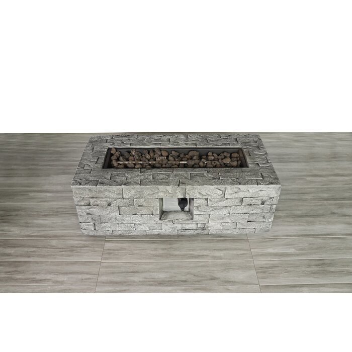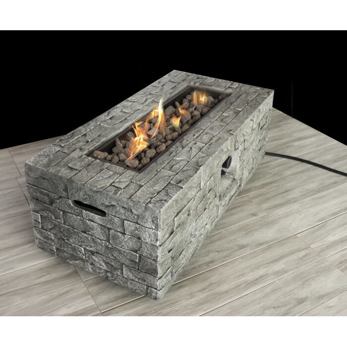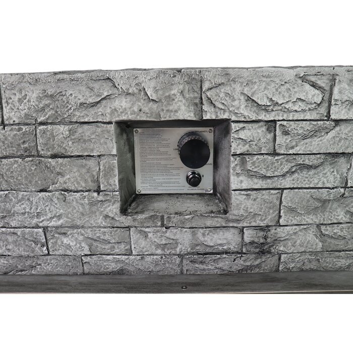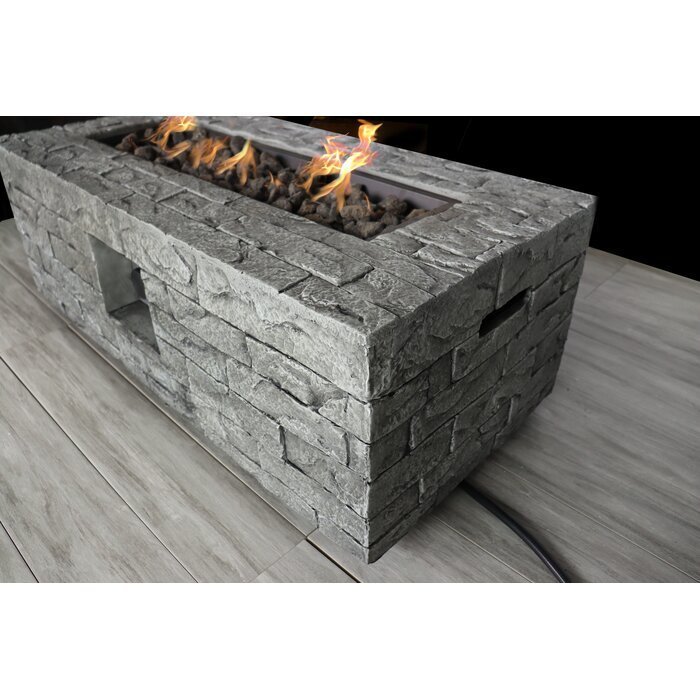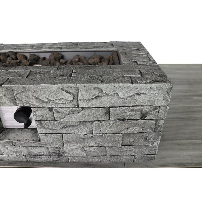 FeaturesProduct TypeFire pit tableExterior MaterialFiber Reinforced ConcreteExterior Material DetailsFiber Reinforced ConcreteBurning Area MaterialStainless steelBurning Area Material DetailsStainless SteelFinishCast StoneFuel TypePropane; Natural gasGas Conversion FeatureYesGas Conversion Kit IncludedNoAdjustable FlameYesIgnition TypePush-buttonBTU Output50000 BTUHeat Resistant CoatingYesFiller AccommodatedLava rocksFiller IncludedYesFoldableNoRust ResistantYesWeather ResistantYesPortableNoCover IncludedYesCover MaterialNylonSpark Screen IncludedNoLog Grate IncludedNoProduct CareClean with mild soap and waterLocationOutdoor Use OnlyIs this Product Safe for Use on Wooden Deck?Can be placed directly on wooden deckBatteries RequiredYesBatteries IncludedYesProduct ShapeRectangularGas Tank Size Accommodated20 PoundsNatural Variation TypeNatural Stone Color VariationSupplier Intended and Approved UseResidential Use; Non Residential UseProduct SizeSmallImportedYesBattery or Battery IncludedYesSpecificationsETL ListedYesAssemblyLevel of AssemblyNoneAssembly RequiredNoWarrantyCommercial WarrantyYesProduct WarrantyYesWarranty Length1 YearFull or Limited WarrantyLimitedWarranty Details1 Year manufacturer limited warranty