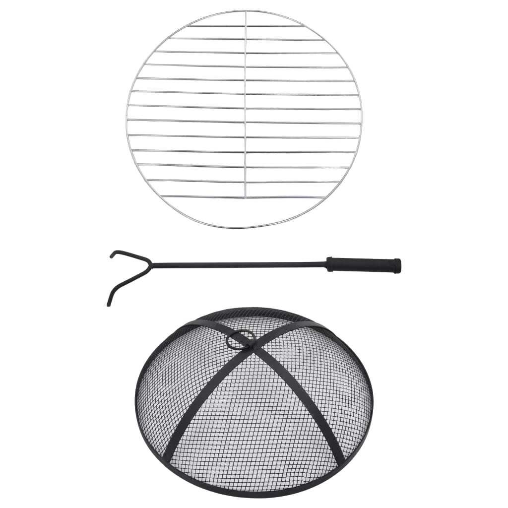 Made of steel, the fire pit bowl is excellent in absorbing and radiating heat. It can be used to burn dry wood, logs or charcoal. The fire pit is supported by a four-leg stand. The included safety mesh allows you to watch the burning fire, and encloses the fire for safety as well as preventing sparks and debris flying out. The poker tool can be used for both removing the mesh cover and rearranging the logs or coal. Additionally, the fire pit table can also be used as a barbecue. Its round ceramic surface offers a perfect place for drinks and roasting supplies. Please note this product is not suitable to be left outside in cold condition.