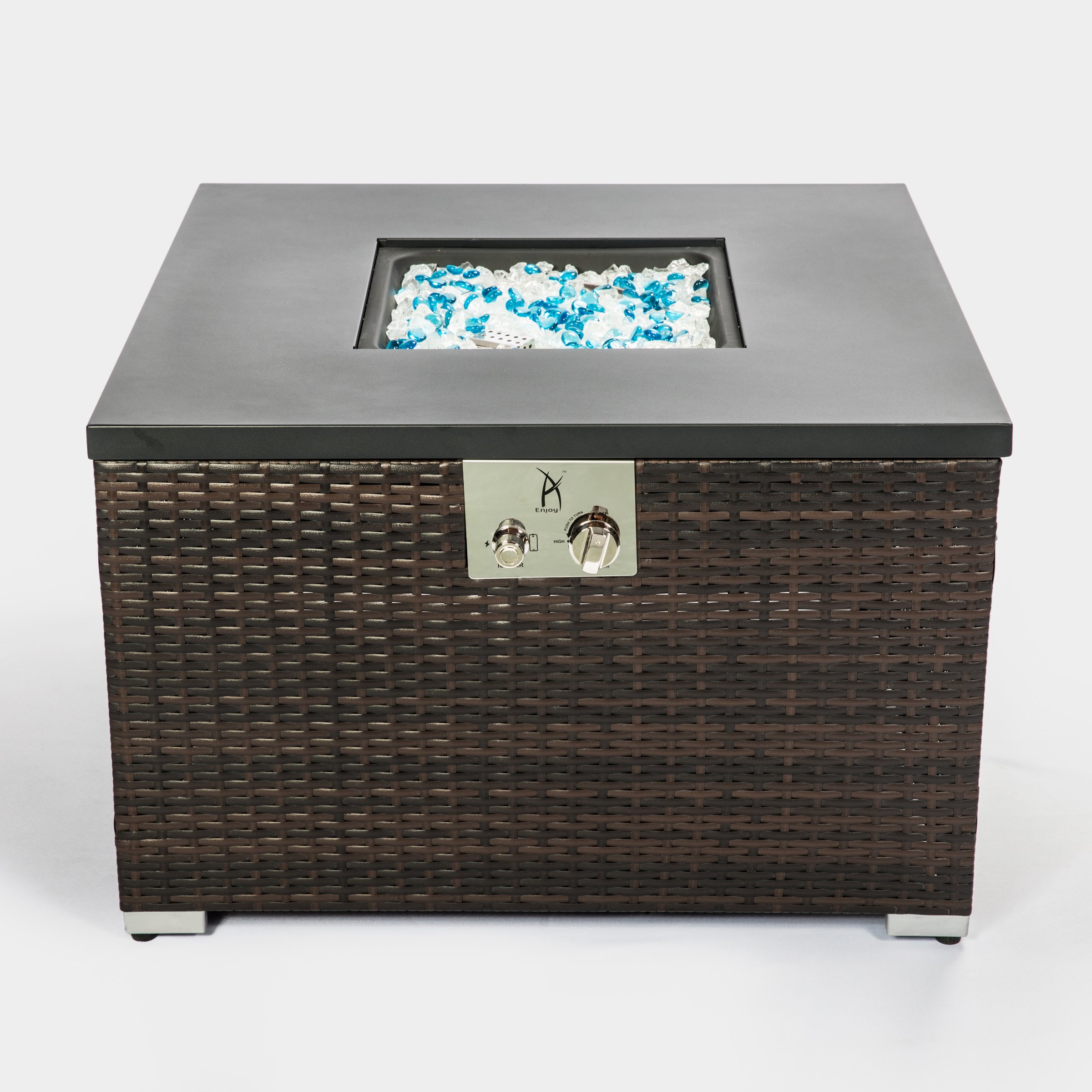 Outdoor Gas Fire Pit Square Dark Brown Wicker Fire Pit Table Propane Fire Table with Glass Rocks