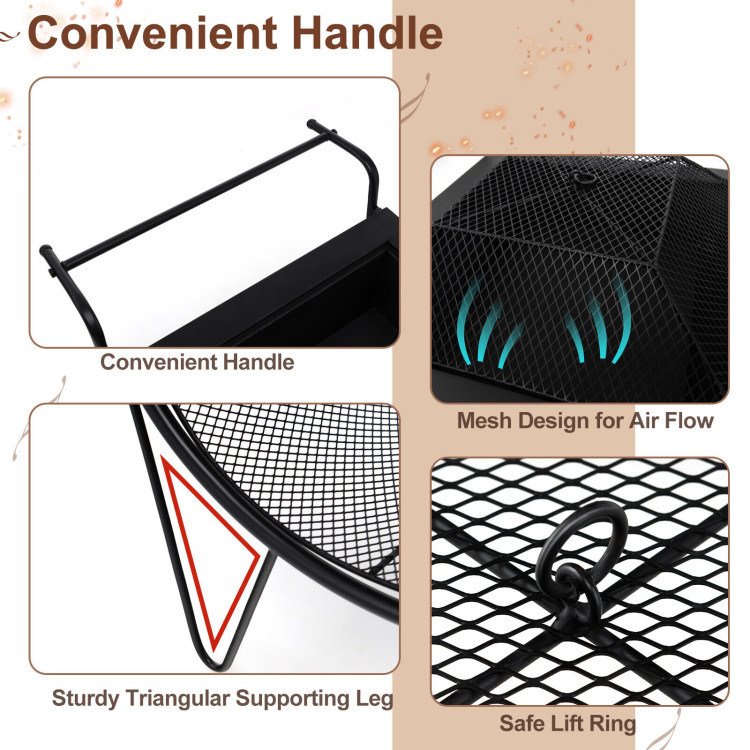 When you burn logs in the fire pit, the spark screen effectively protects you from flying embers. The mesh design on the spark screen is good for air flow. Besides, the round ring allows you to lift the screen safely. And the sturdy steel frame is high-temp resistant for extra security.