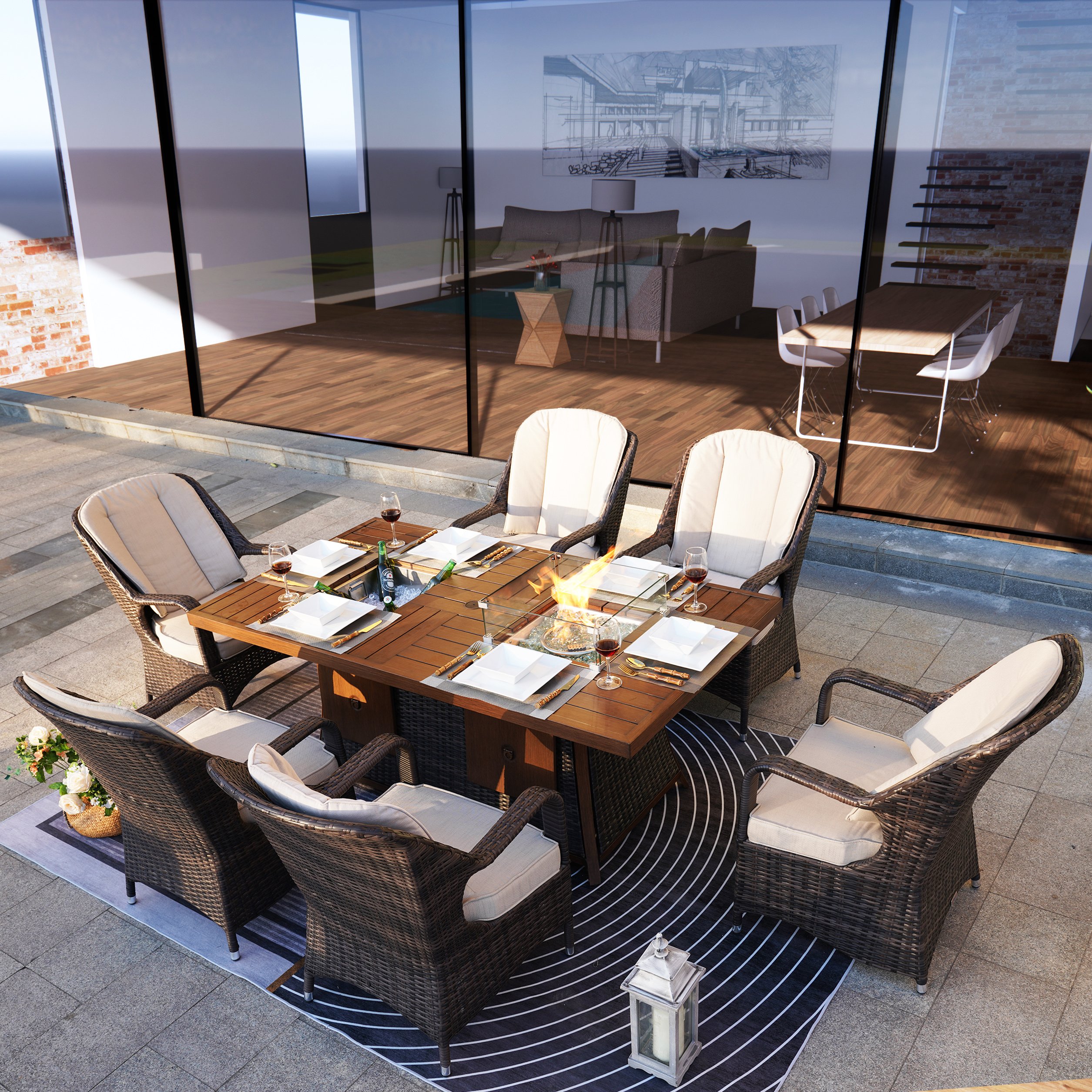 Brighten the look of your outdoor space with the 7-Piece Patio Gas Firepit And Ice Container Rectangle Dining Set with 6 Standard Height Chairs. We upgrade the fragile glass and rattan tabletop to a brown finish aluminum coating tabletop; which can extend the service life of this product.  In addition to the original firepit system; we have added an ice container function; which allows you and your family to enjoy the beautiful fire while also enjoying a delicious beverage.  It can meet your various outdoor needs. The encounter of fire and ice will bring you double enjoyment.  We highly recommend purchasing it!