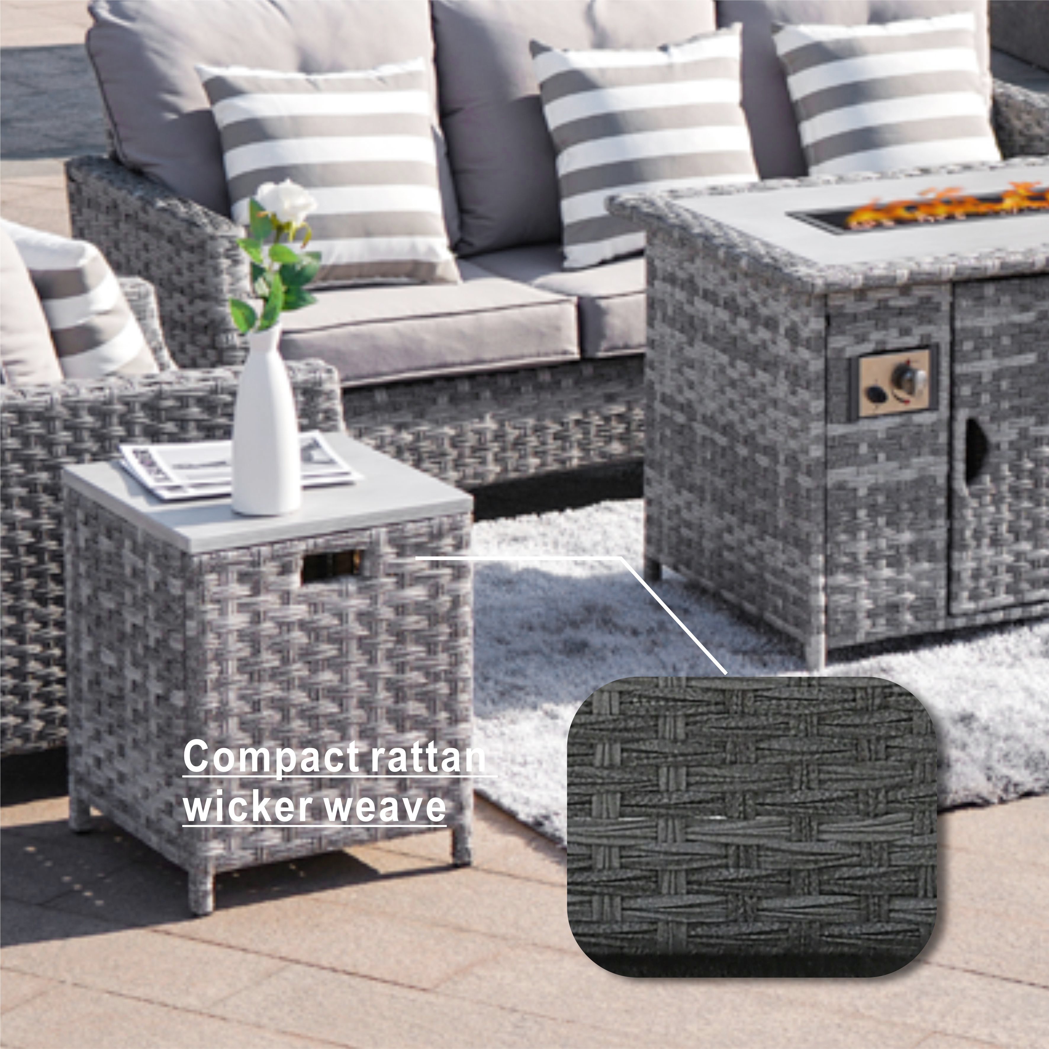 Includes: one 3-seater sofa, 2 single sofa, 1 side table, 1-gas firepit table