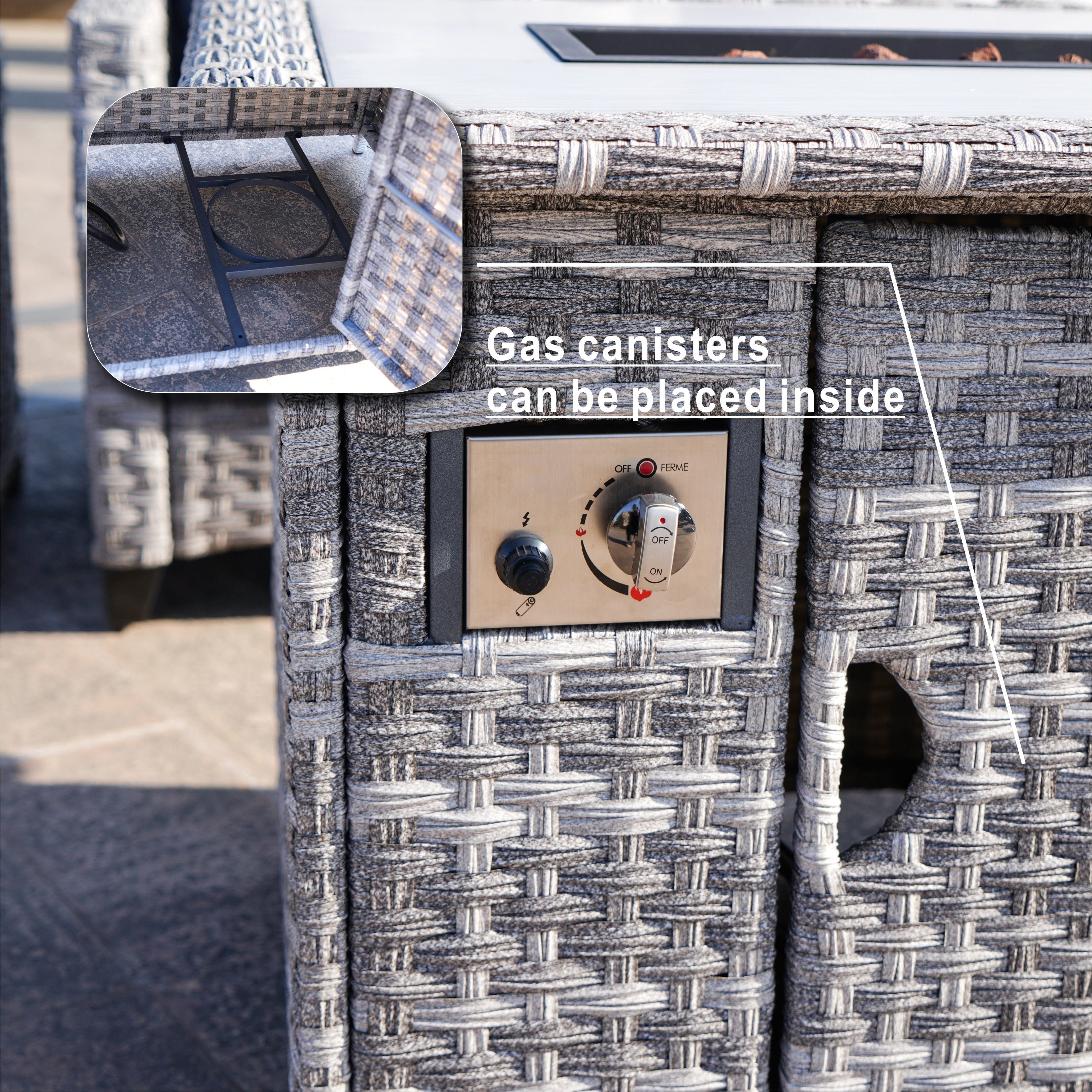 Enjoy your backyard again with this deep-seating sofa and fire pit set. You can enjoy the heat of the fire during the cool nights, allowing you to spend all day and night in your backyard space. The gas firepit table has a grey aluminum inlaid rectangle-shaped top and a built-in burner system complete with red lava rocks. Made with top-quality wicker and water-resistant fabric cushions, the large gas fire pit sofa set will have you loving your backyard again.