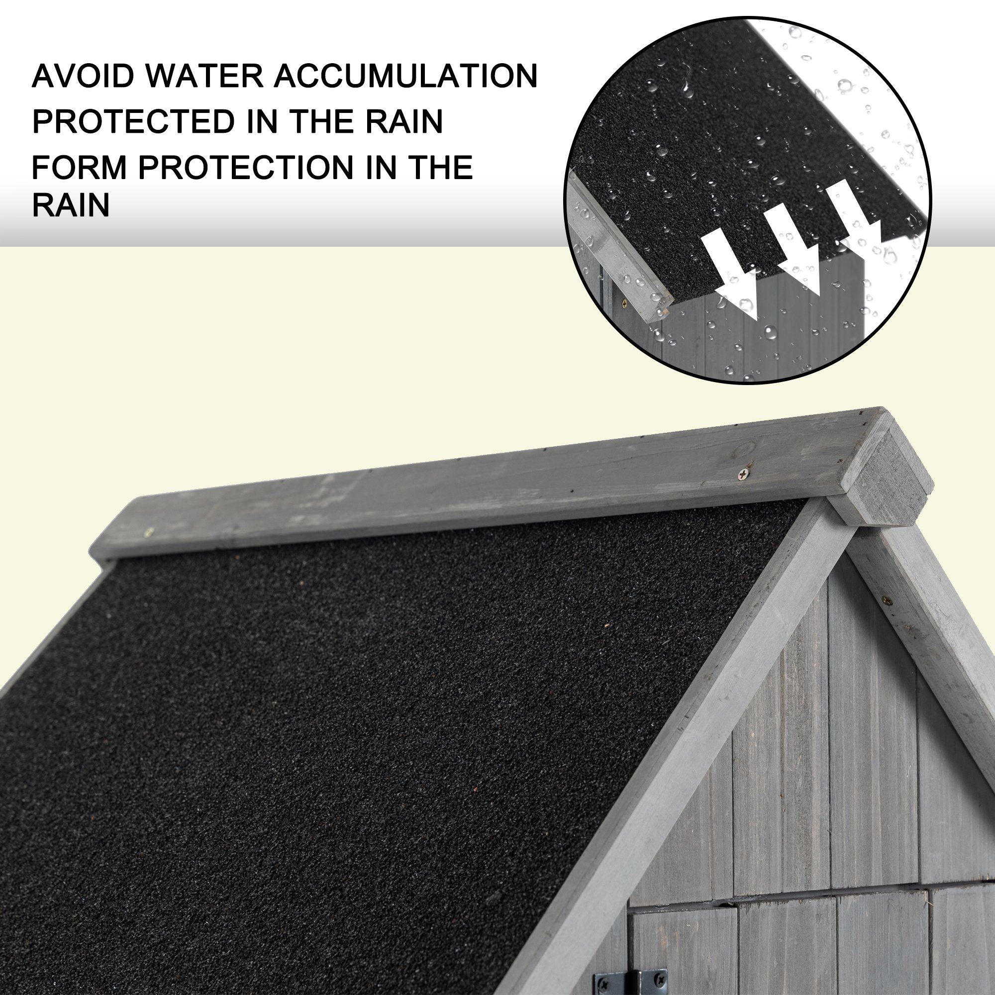 MaterialWood & AsphaltColorGray ColorWeight49 lbsWood Thickness0.36" /0.48"Overall size30.3"L X 21.3"W X 70.5"H(including the roof side)Window Door Size10.4"L x 6.9"WBottom Floor25.6"L x 18.11"WDoor Size20.3"L x 48.2"W