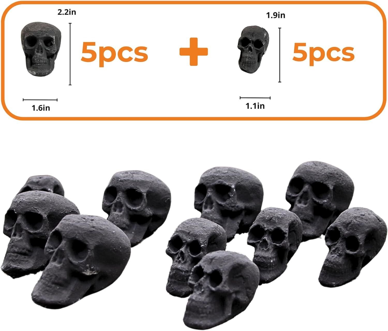 I highly recommend our skull fire logs to you. It's really, really, really cool!It has a total of 4 sizes, the largest is no bigger than a palm, the smallest is just a thumb. Therefore, his adaptability is particularly strong, it can be used in candlesticks, alcohol stoves, and can also be combined in fire pits and fireplaces, wherever it is sure to be the focus. Each one of our skull firepit heads is handmade, you can fully feel the vividness of their shapes, each one is very similar, but they are not the same, you put them there, the shapes are very vivid. We specially set 7/10/12 as a group, making it very easy to put together, you can just buy one to use the size you need, but also try different sizes of wonderful combinations, it will definitely decorate your party, let everyone marvel at your creativity. Package Included: 7pcs ceramic Skull logs set: "6.1 x 5 x 5.8cm" ceramic skulls for fire pit 4 Different Sets Size: 7pcs skull gas logs set: "7 x 5 x 7cm" firepit skulls large 7pcs ceramic Skull logs set: "6.1 x 5 x 5.8cm" ceramic skulls for fire pit 10pcs Skull firelogs set: 5pcs "4.3 x 2.5 x 3.4cm" fireplace skulls and 5pcs "5 x 4 x 4cm" ceramic skulls for fire pit 12pcs firepit skull logs set: 3pcs "5 x 4 x 4cm" skulls for fire pit, 3pcs "6.1 x 5 x 5.8cm" skull fire logs, 3pcs "4.3 x 2.5 x 3.4cm" skull fire pit stones,3pcs "7 x 5 x 7cm" human skull fire pit Experience a spine chilling Halloween with our Fire Pits Skulls!